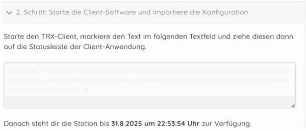 Um die Konfiguration in die Client-Software zu importieren, müssen der TRX-Client und die „mein DARC“ Seite geöffnet sein. Beide Seiten müssen auf dem Bildschirm platziert werden, damit die Textdatei (aktivieren durch doppelt Klick! dadurch wird sie „blau“) von der DARC-Seite in die Statuszeile unten links im TRX-Client verschoben werden kann. Klicken ziehen. Gleichzeitig wird die Nutzungsdauer mit angezeigt, jetzt z.Z. bei ca. 50 Minuten.