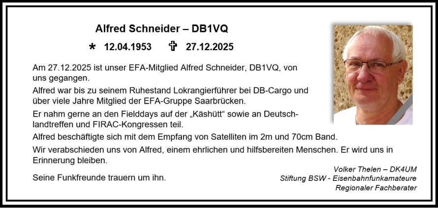 Die Eisenbahn-Funkamateure trauern um Alfred Schneider, DB1VQ. Alfred ist am 27.12.2025 verstorben. Er war Mitglied der EFA-Gruppe Saarbrücken.
